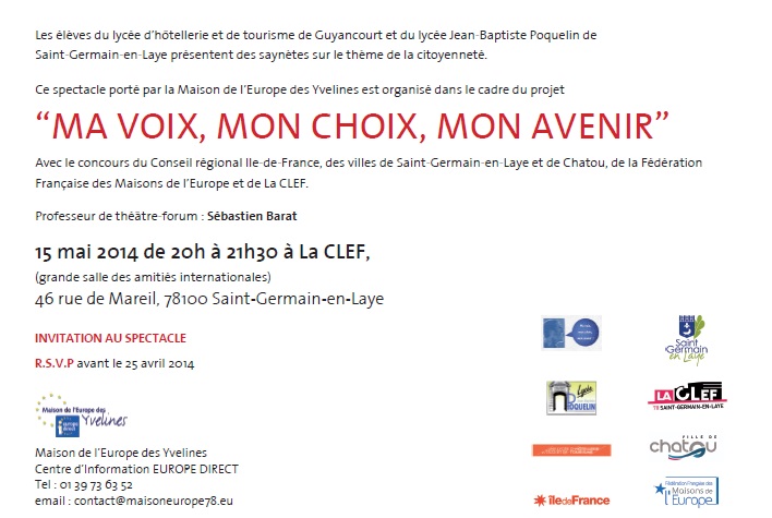 Après une série de cours de théâtre-forum, les élèves des deux lycées partenaires de Guyancourt (Hôtellerie et Tourisme) et de Saint-Germain-en-Laye (Poquelin) ont présenté un spectacle final, le 15 mai 2014 à la veille des élections européennes, dans la salle de théâtre de l'association partenaire du projet, la Clef à Saint-Germain-en-Laye.