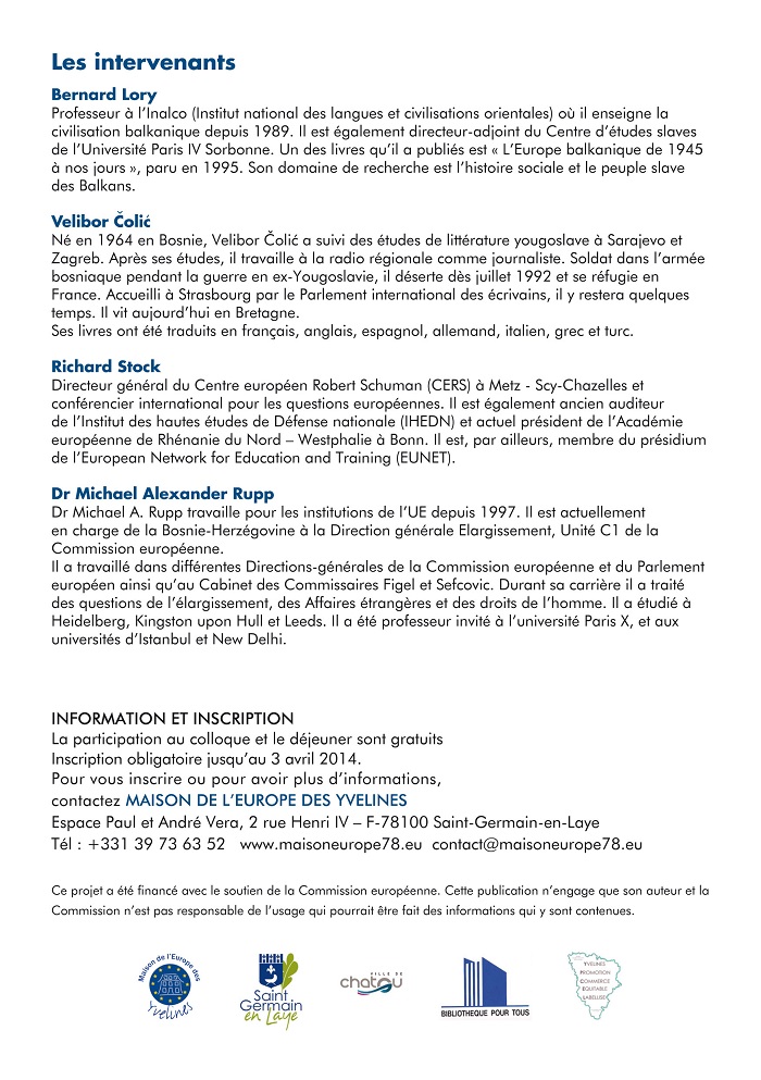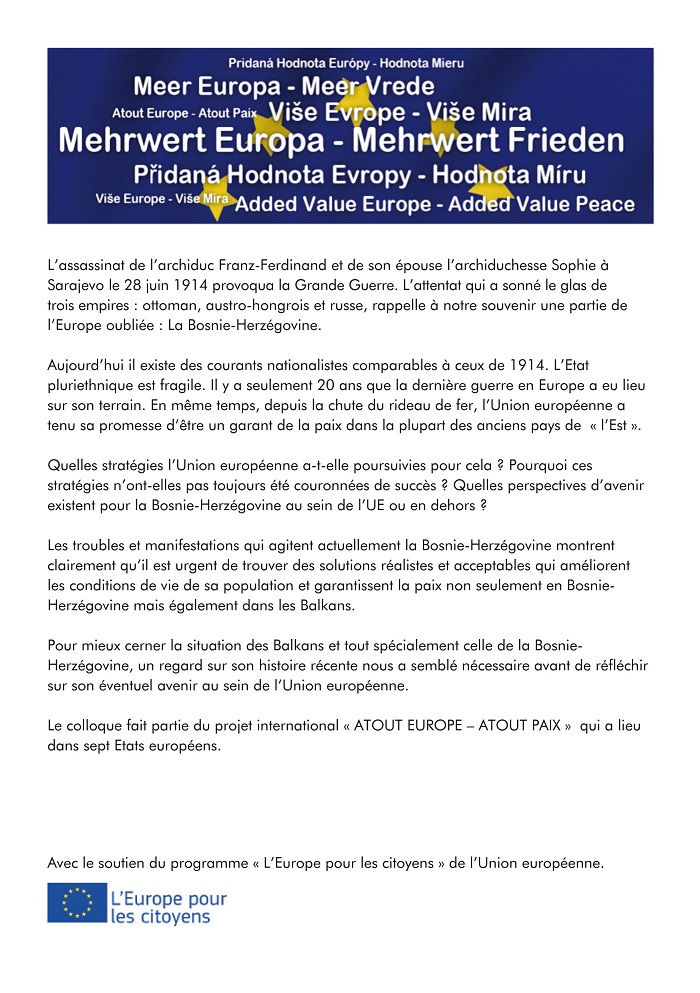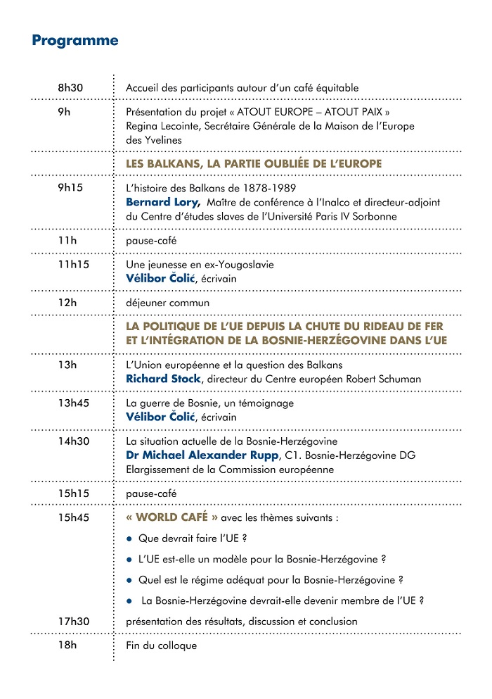 10 avril, de 9h à 18h, grand colloque organisé par la Maison de l'Europe des Yvelines à Saint-Germain-en-Laye- Bibliothèque Multimédia 9 rue Henri IV. Cette conférence a lieu dans le cadre d'un vaste projet européen intitulé "Atout Europe - Atout Paix" et traite du cas de la Bosnie-Herzégovine.
