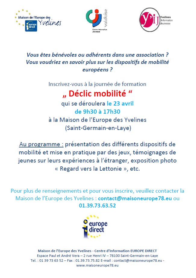 23 avril, de 9h30 à 17h30, dans les locaux de la MdEY : journée de formation des bénévoles, adhérents ou non de l'association sur le thème "Déclic Mobilité". La MdEY vous ouvre ses portes pour :