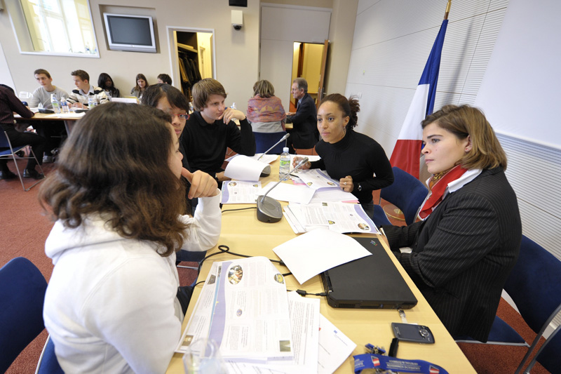 de la Maison de l'Europe des Yvelines devant les élèves de 4ème du collège Paul Bert sur le thème des institutions européennes.