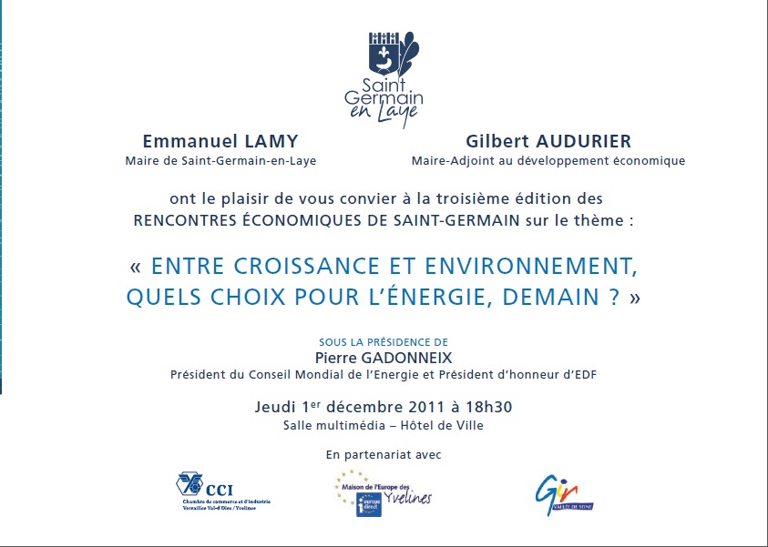 1er décembre 2011, 18h30 : La Maison de l'Europe des Yvelines vous convie à participer au colloque qu'elle propose en collaboration avec la ville de Saint-Germain-en-Laye sur le thème "entre croissance et environnement, quels choix pour l'énergie, demain ? ". Visualisez l'invitation et la procédure d'inscription via le service économique de la ville.