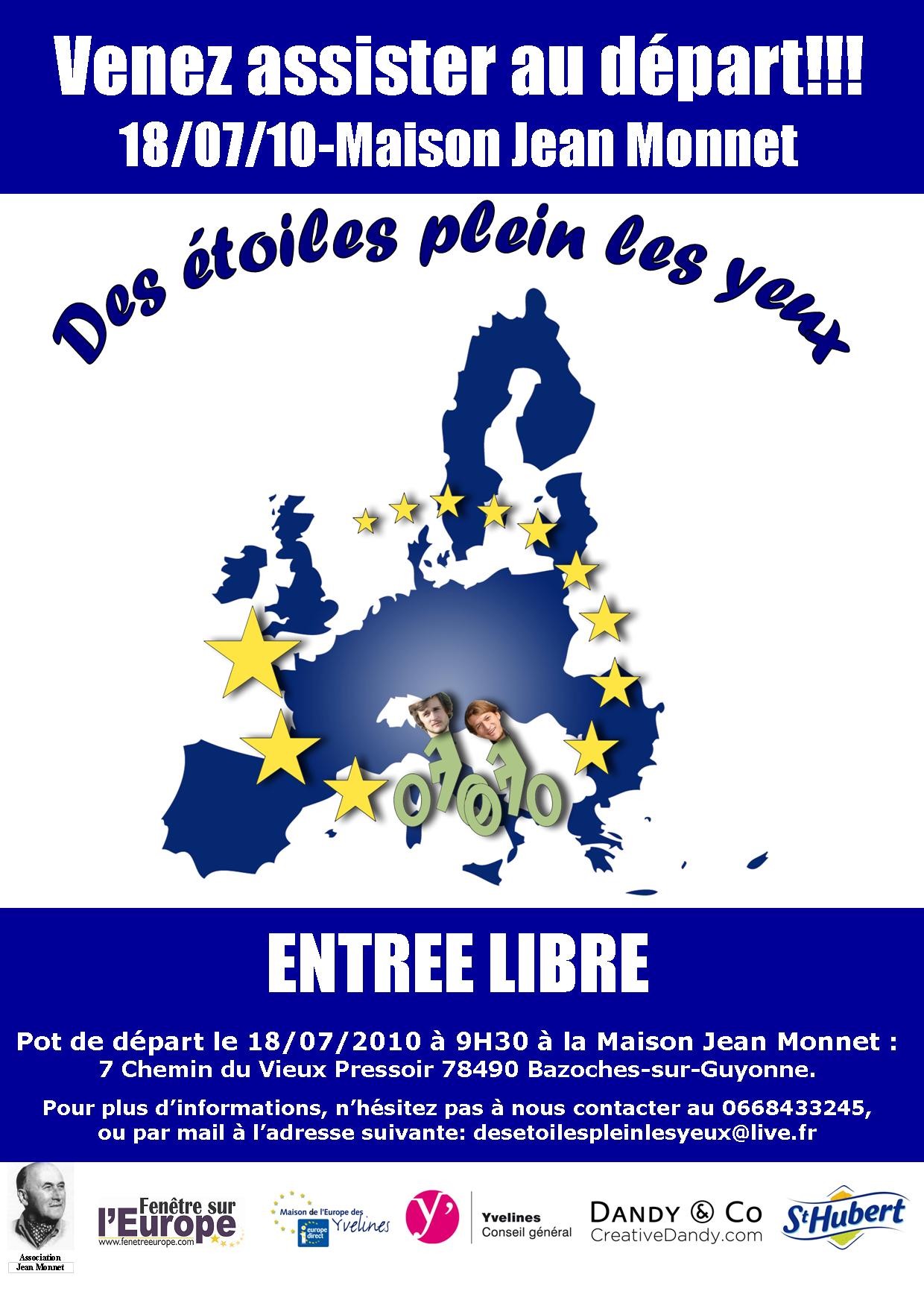 - 18 juillet : à Houjarray, dans la Maison Jean Monnet, deux jeunes débutent leur parcours européen intitulé Des étoiles plein les yeux, projet soutenu par la Maison de l'Europe des Yvelines. Si vous souhaitez les encourager avant le départ, rendez-vous au 7 chemin du vieux pressoir, 78490 Bazoches-sur-Guyonne(9h30).