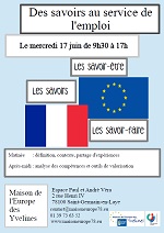 17 juin, de 9h30 à 17h, la Maison de l'Europe des Yvelines et son Centre d'information Europe Direct organise en collaboration avec le Centre d'information Europe Direct du Val d'Oise une journée d'information sur la valorisation du savoir, savoir-être, savoir-faire. Vous possédez une expérience d'engagement, une expérience professionnelle ou simplement une expérience de vie et vous souhaitez avoir des conseils pour la valoriser afin de partir à l'étranger; ou bien vous revenez de l'étranger et souhaitez valoriser l'expérience acquise pour vous insérer professionnellement, alors rejoignez-nous pour cette séance utile.