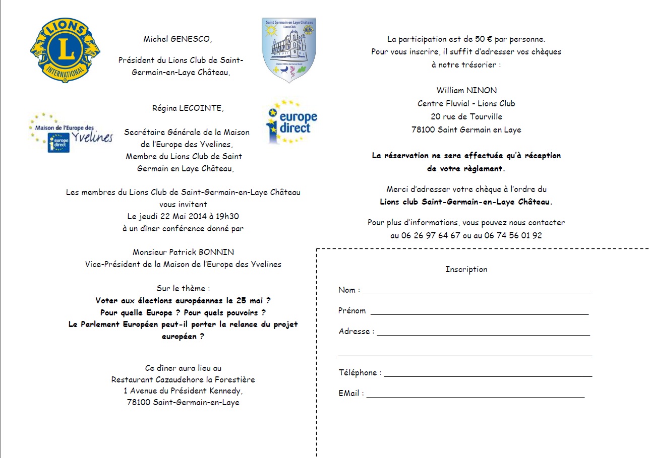 22 mai, à 19h30 : dîner conférence organisé par le Lions Club de Saint-Germain-en-Laye Château et la Maison de l'Europe des Yvelines. Le débat sera animé par Monsieur Patrick BONNIN, Vice-Président de la Maison de l’Europe des Yvelines
