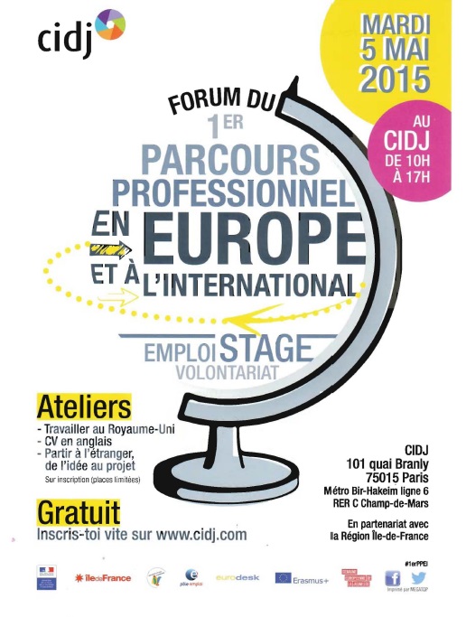 La Maison de l'Europe des Yvelines sera présente au forum du 1er parcours professionnel à l’international, organisé par le CIDJ le 5 mai 2015. Le forum se tiendra au 101 quai Branly Paris 15ème de 10h à 12h.