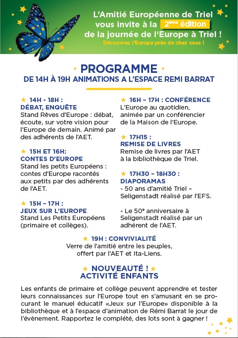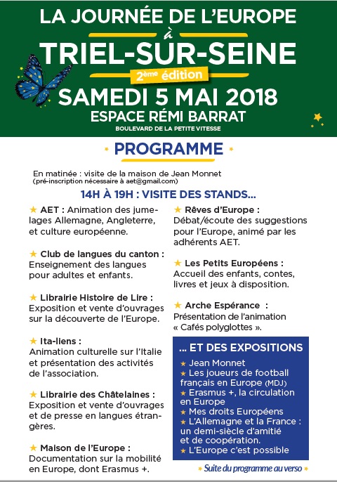 5 mai, Journée de l'Europe à Triel-sur-Seine en présence du responsable du CIED de Saint-Germain-en-Laye. Animation (voir le programme ci-contre), conférence l'Europe au quotidien" animée par la Maison de l'Europe des Yvelines et tenue d'un stand documentaire notamment sur Erasmus+.