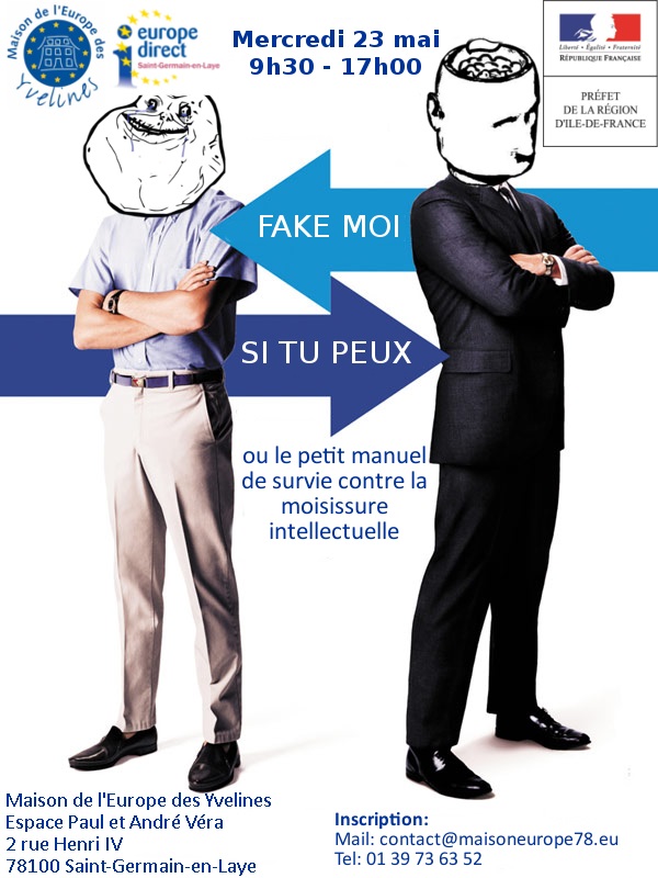 C’est pourquoi, la Maison de l’Europe des Yvelines vous invite à sa première session « Fake moi si tu peux ». Cette journée sera l’occasion de voir et découvrir différentes techniques de communication et d’argumentation utilisées afin de manipuler, tromper ou rallier le public à sa cause.