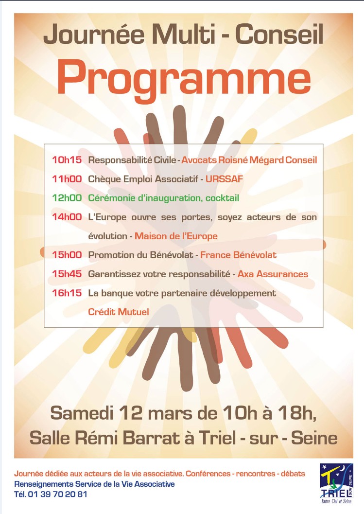 12 mars : journée multi-conseils aux associations de la communauté d'agglomérations [Carrières sous Poissy, Andrésy, Chanteloup, Chapet, Verneuil sur Seine], proposée par la ville de Triel sur Seine. La MdEY tient un stand d’informations sur l’Europe (les institutions/les programmes européens) et apporte son aide aux administrateurs associatifs pour répondre à des Appels à propositions sur le Programme Citoyenneté de l’UE. Visualisez l'affiche.
