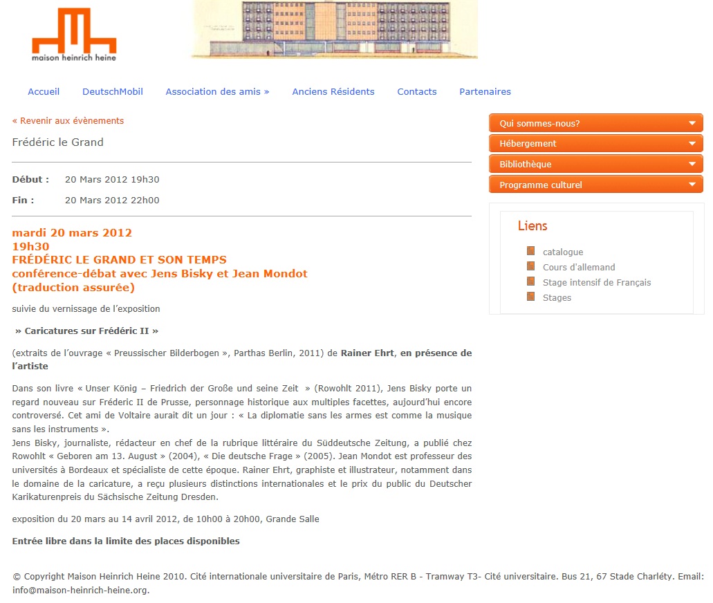 20 mars 2012, à 19h30, à la Maison Heinrich Heine à Paris (14ème) : pour ceux qui n'auraient découvrir les caricatures de Rainer Ehrt lors de sa venue à Saint-Germain-en-Laye le 23 janvier dernier (organisée par la Maison de l'Europe des Yvelines), ils pourront voir l'exposition FRÉDÉRIC LE GRAND ET SON TEMPS, suivie d'une