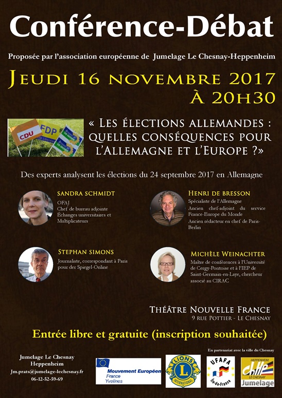 "Les élections allemandes : quelles conséquences pour l'Allemagne et l'Europe ?" organisée par l'association européenne de jumelage Le Chesnay Heppenheim, en présence de nombreux intervenants