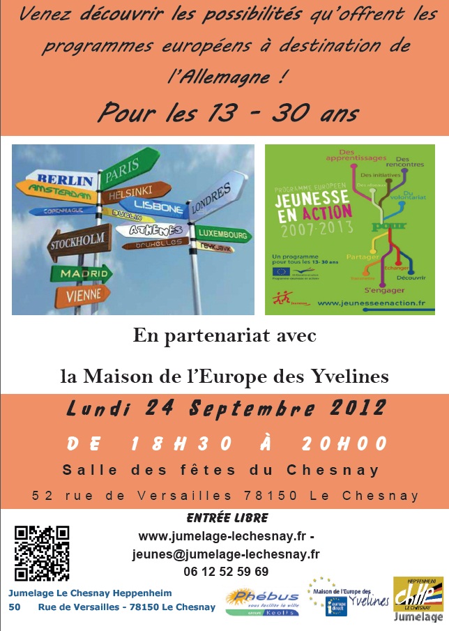 24 septembre 2012, la Maison de l'Europe des Yvelines effectue une formation auprès des représentants de l'Association européenne de jumelage Le Chesnay - Heppenheim, pour le montage de projets à dimension européenne. Se rendre sur le site